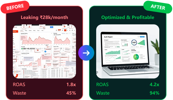 Our ₹499 audit shows you where your ads are broken, how much you’re losing, and exactly what to fix. No fluff, no generic advice — just specific actions that will save you thousands.